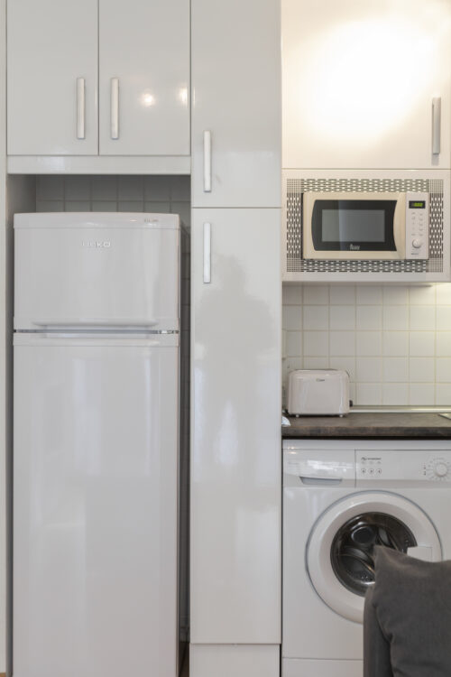 La cocina de estilo americano, contempla todos los electrodomésticos (frigorífico, horno, lavadora, vitrocerámica y lavaplatos).
