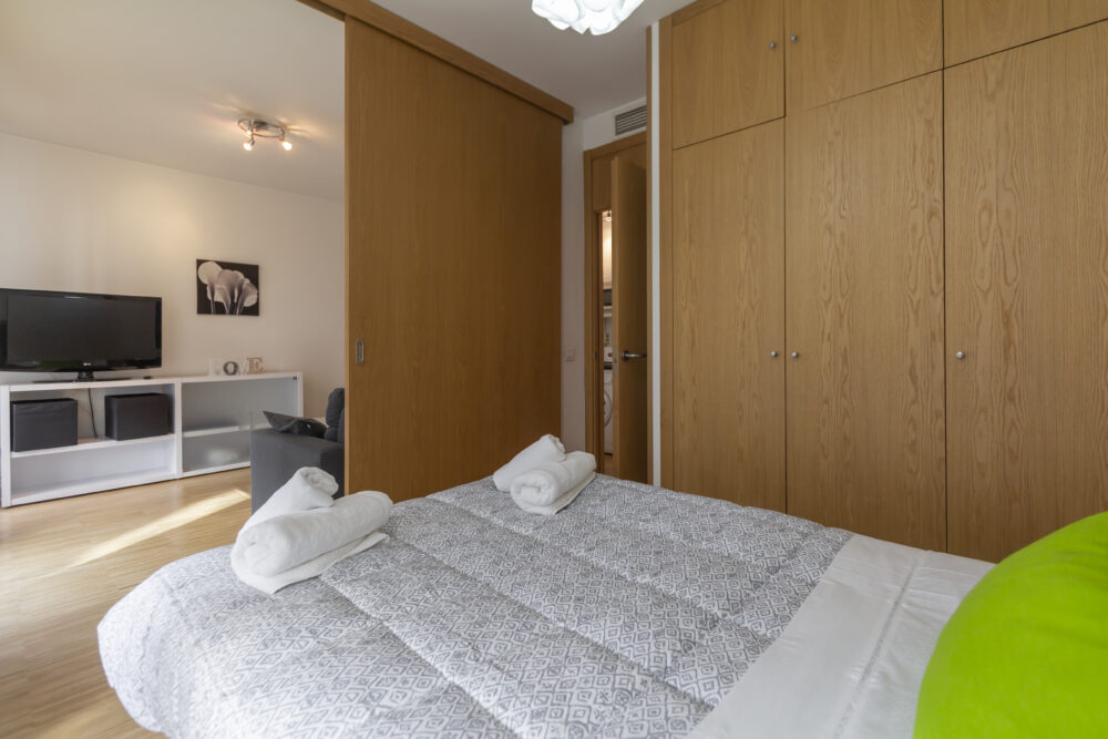 El dormitorio, independiente del resto de la casa se comunica con el salón comedor a través de una gran puerta corredera. Éste alberga una cama doble y de un gran armario empotrado.