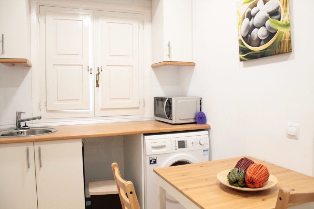 La cocina, completamente equipada con lavadora, frigorífico y horno microondas. Dispone de una mesa de comedor y de un armario empotrado completamente vestido.