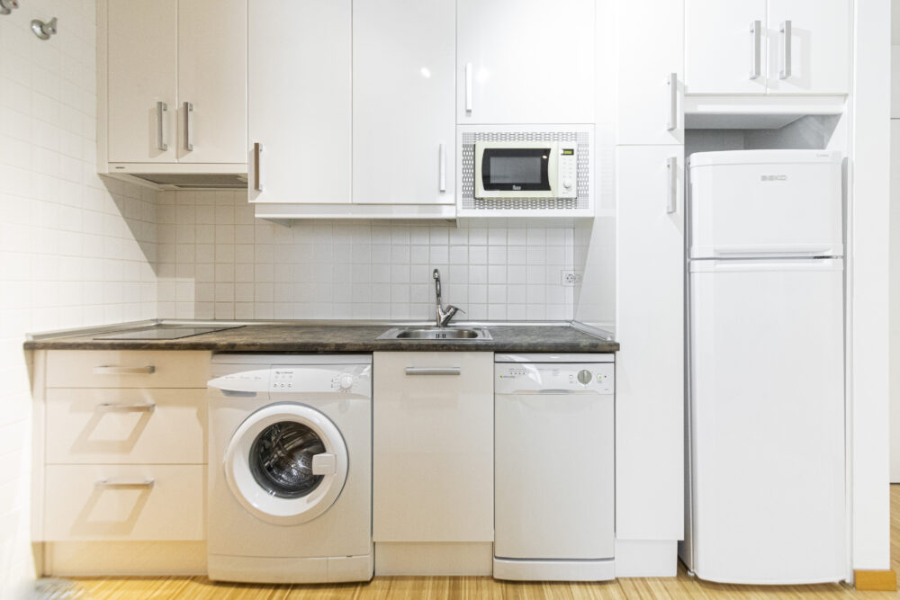 La cocina de estilo americano, contempla todos los electrodomésticos (frigorífico, horno, lavadora, vitrocerámica y lavaplatos).
