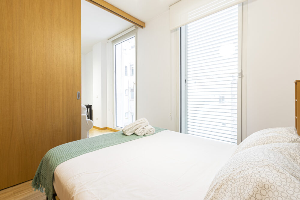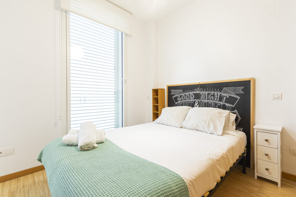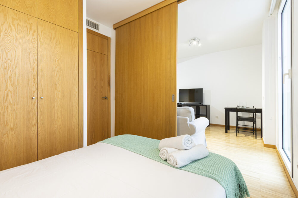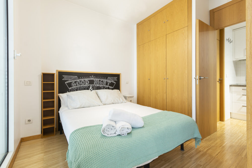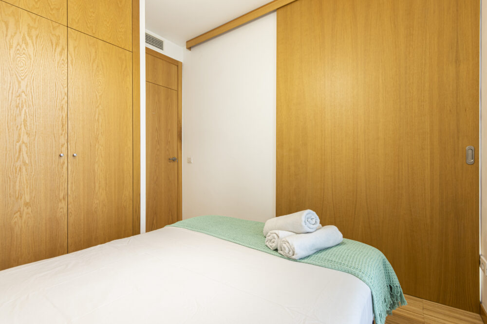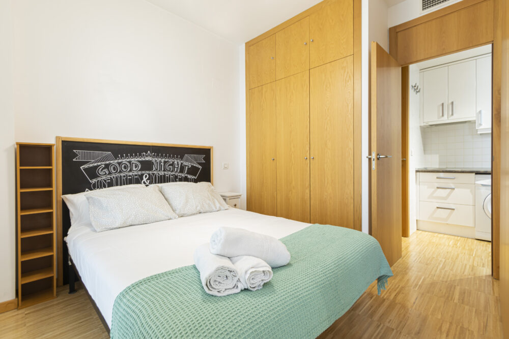 El dormitorio, independiente del resto de la casa se comunica con el salón comedor a través de una gran puerta corredera. Éste alberga una cama doble y de un gran armario empotrado.