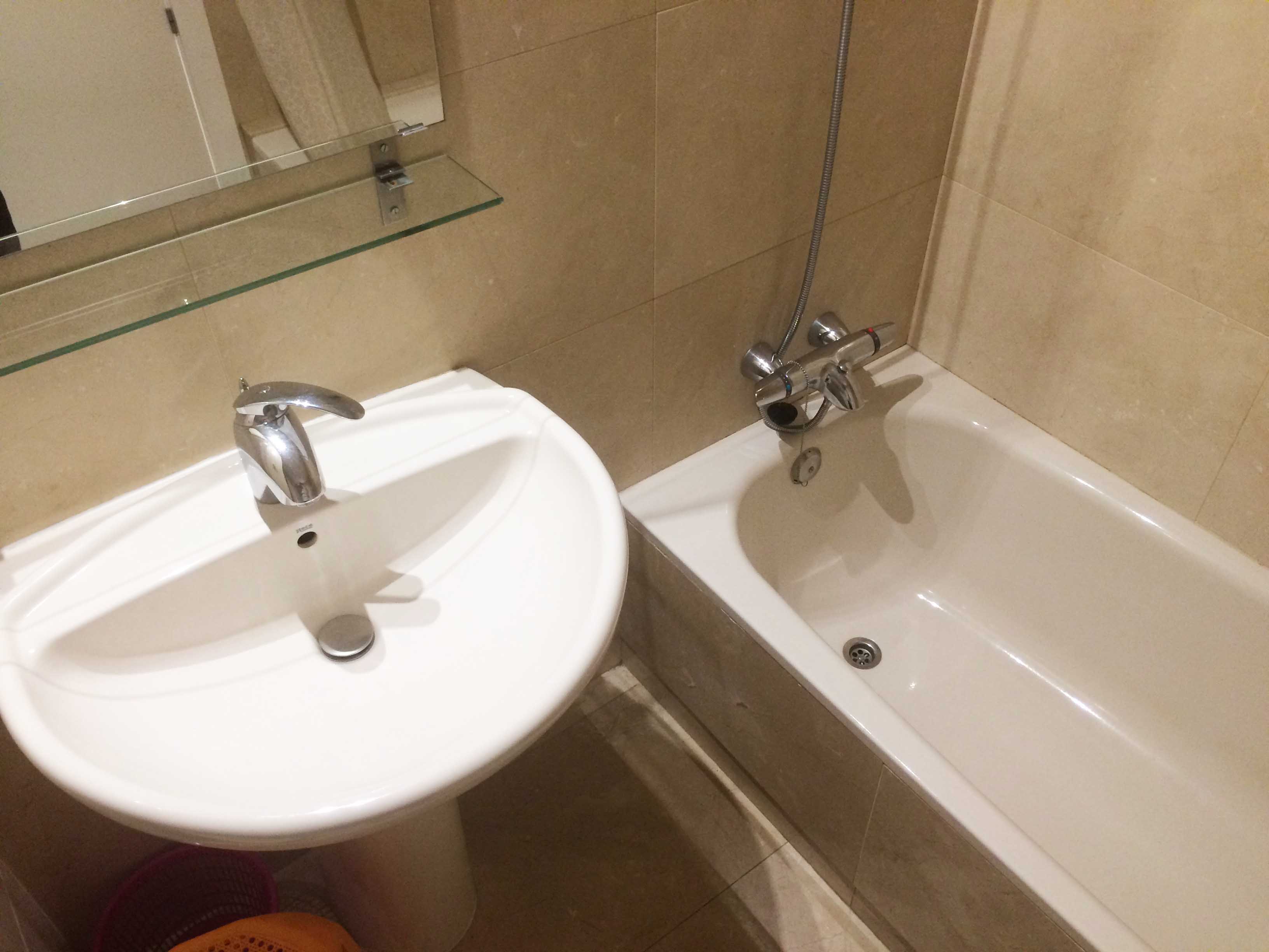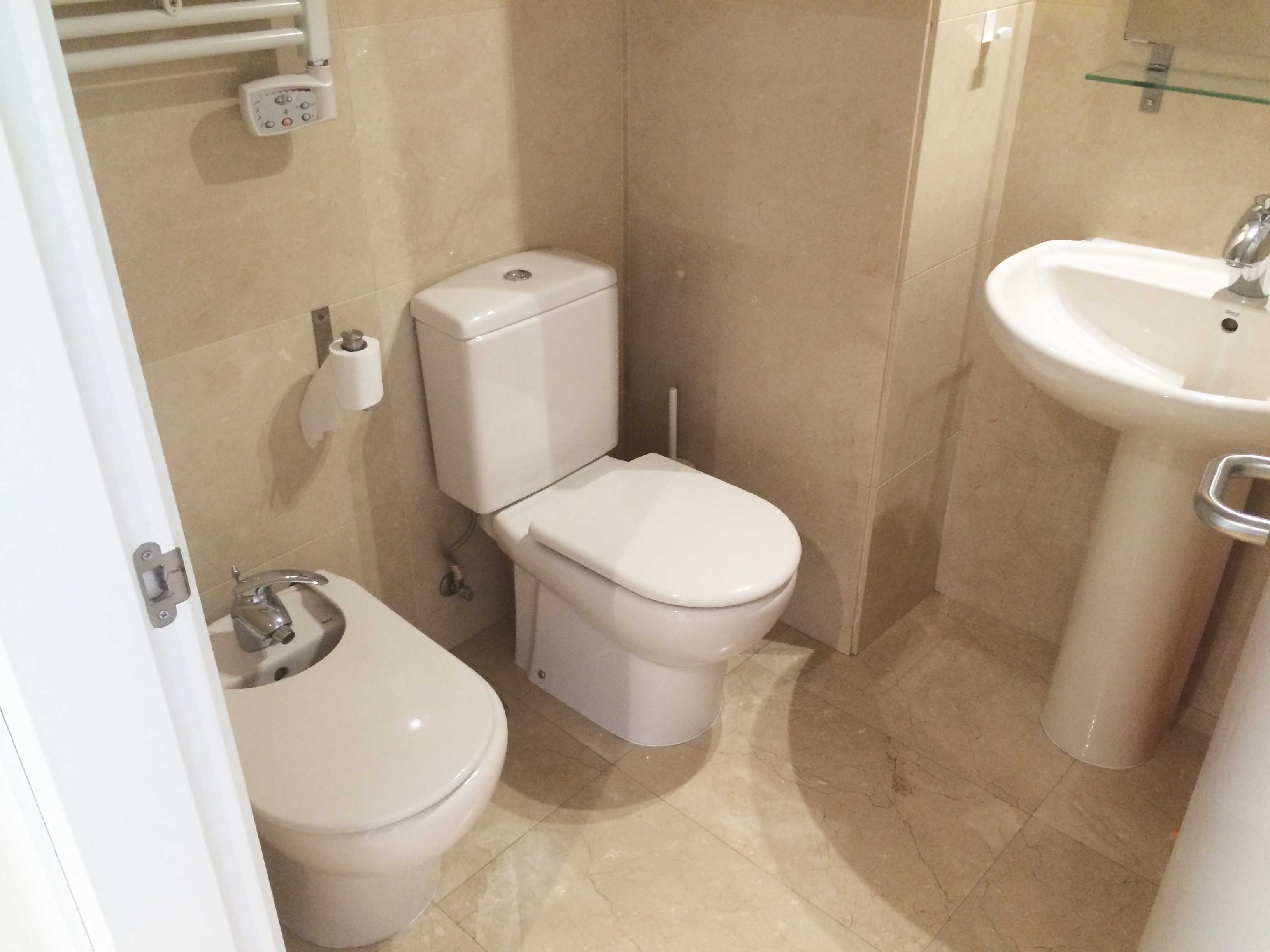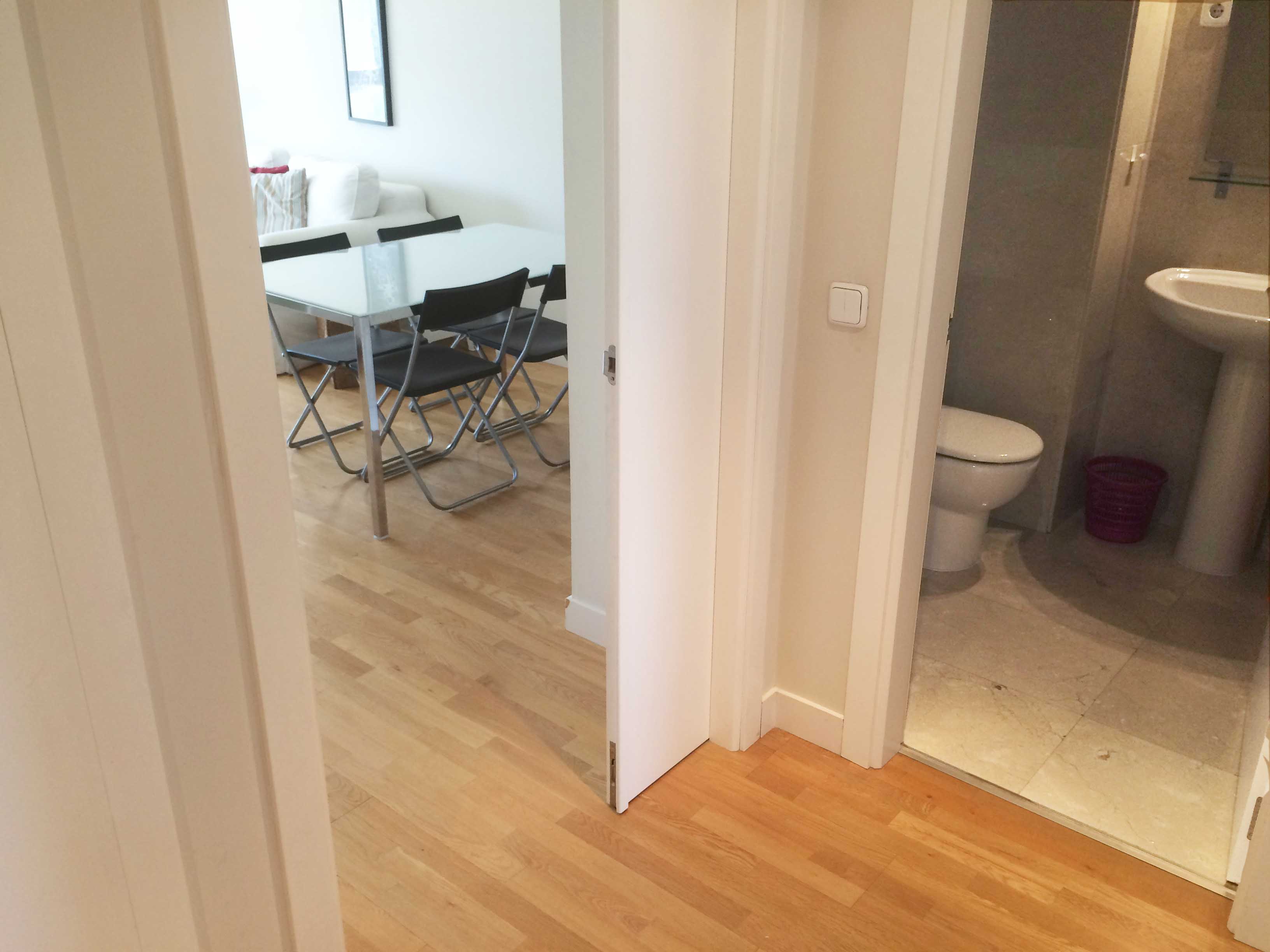 El cuarto de Baño, alicatado en mármol hasta el techo, dispone de bañera y mampara. El suelo del resto de la casa es de tarima, con acabado en roble.