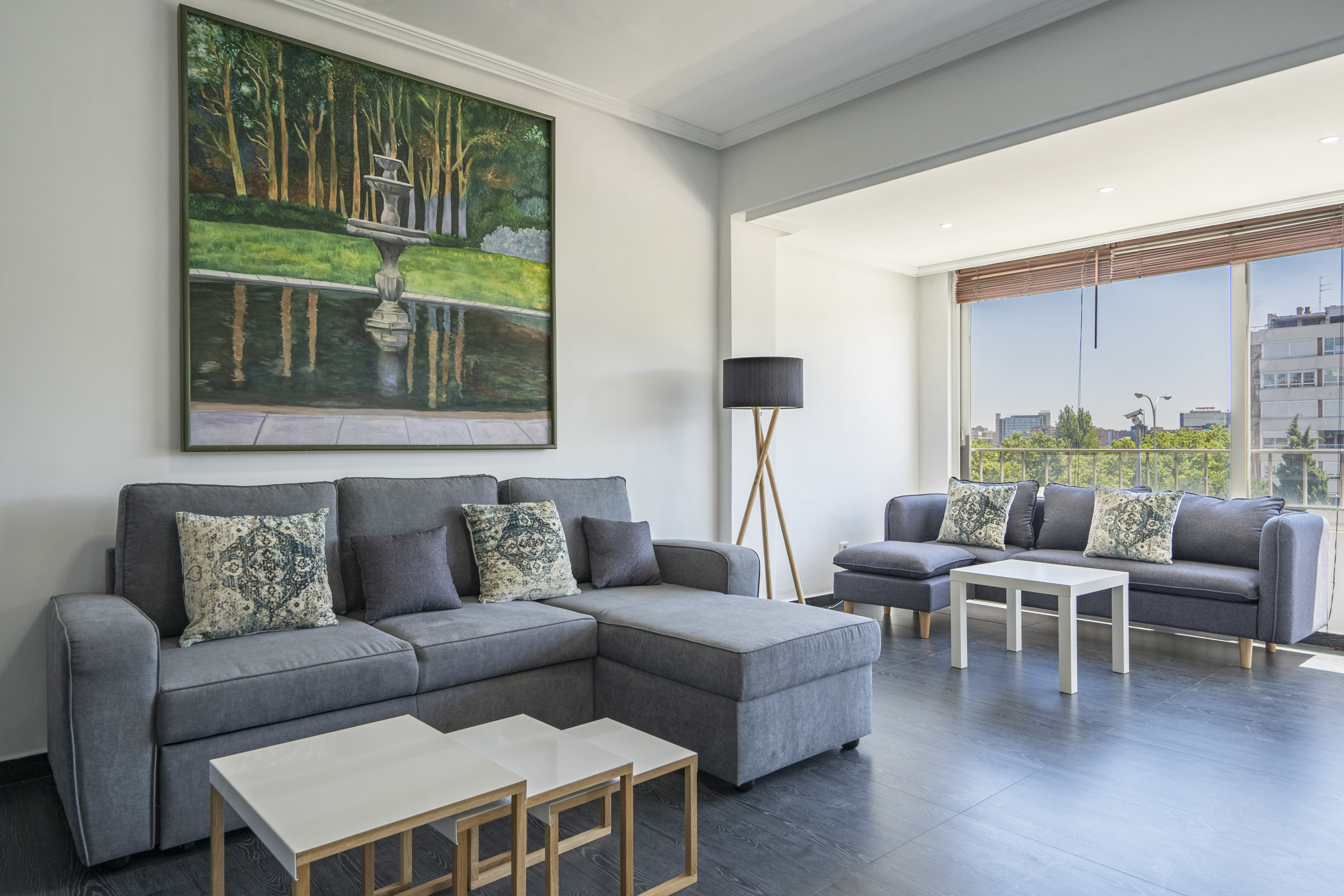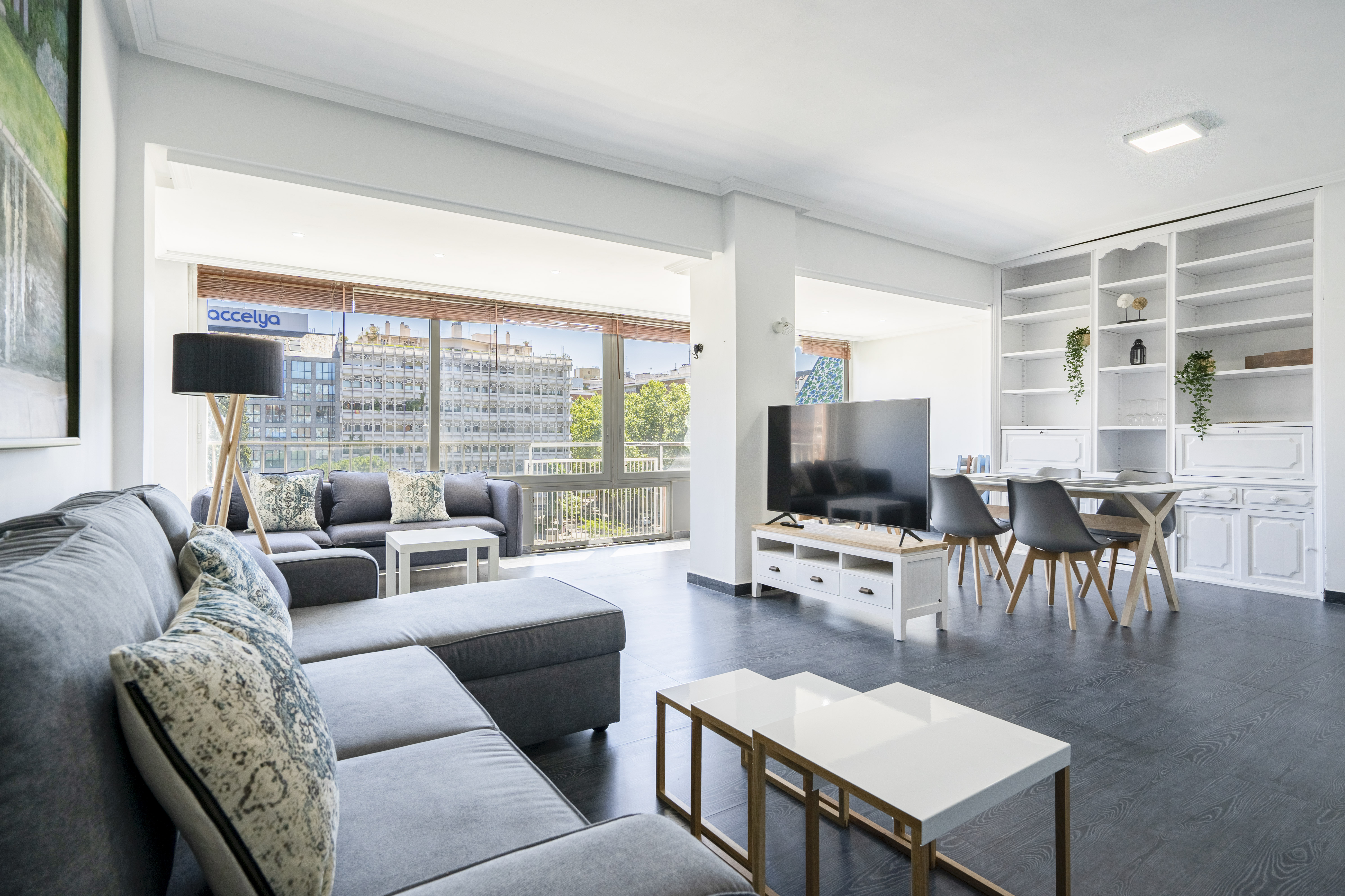 Al entrar en la vivienda está situado un pequeño pasillo que hace las veces de distribuidor desde el cual accedemos a un amplio salón comedor. Éste dispone de dos sofás amplios, dos mesas de comedor, una televisión de 55 pulgadas y unas espectaculares vistas al Paseo de la Castellana.