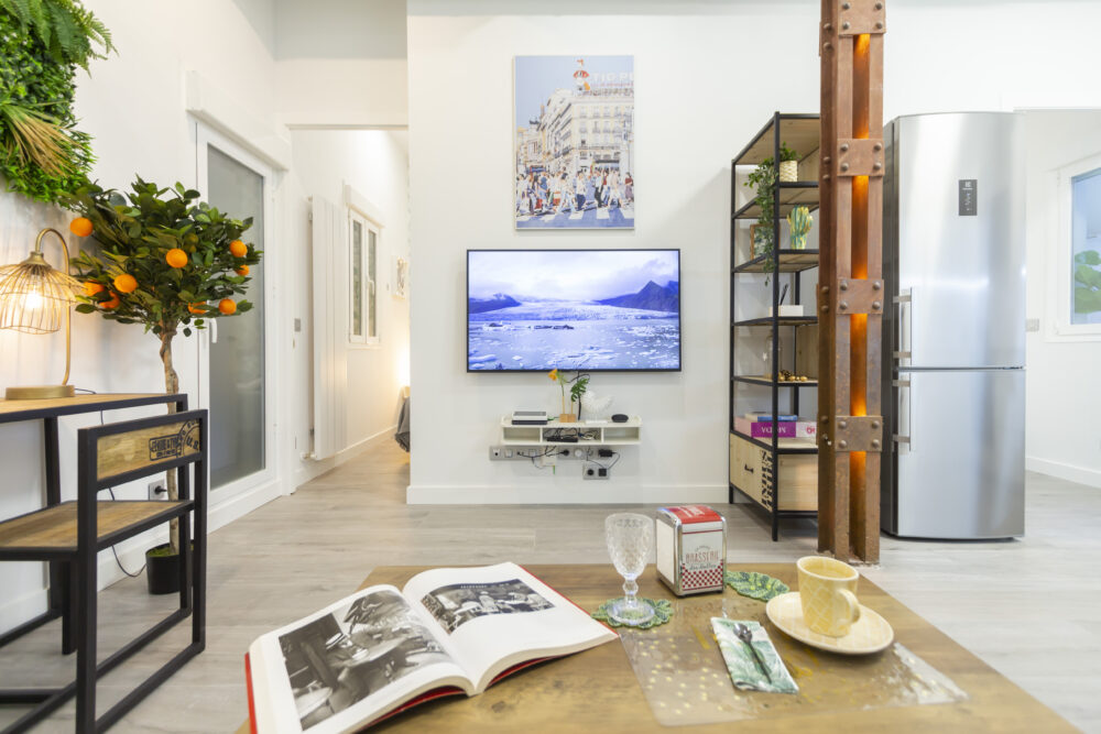 El salón comedor, dispone de un sofá, una mesa de trabajo o estudio, una gran televisión y una amplia cocina que incorpora todos los electrodomésticos.